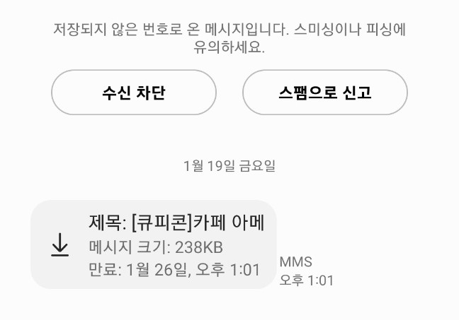 알려지지 않은 번호나 이메일로부터 온 메세지는 스팸일 가능성이 높습니다.